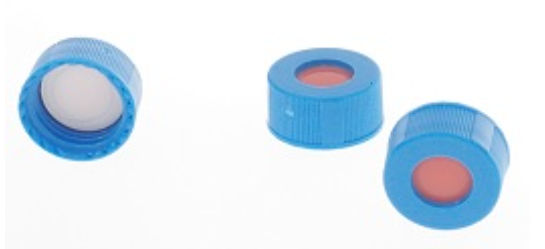 製品名 | 9mm ブルーオープントップスクリューキャップ、ボンディングタイプホワイト PTFE / レッドシリコーンゴムセプタム付き |