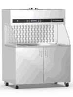 ドア外装には耐腐食・防爆仕様の強化ガラスを採用し、大型ウィンドウ設計としています。洗浄槽内部は一体成形モールド構造で、R形状設計により溶接部やネジを排除し、洗浄デッドスペースをなくしています。本体設置面積は0.5㎡未満です。着脱式スプレーアームにより清掃が容易で、配管式加熱システムを採用しています。